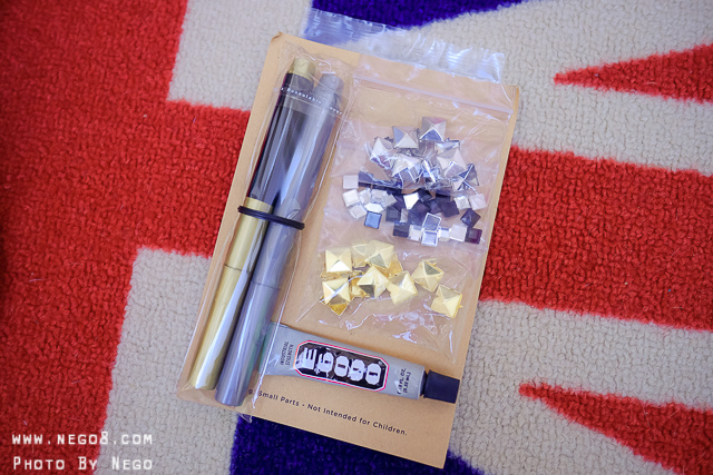 金、銀雙色鉚丁,銀、黑兩色方鑽,膠水,TEVA金、銀色筆,尺,三個小貼布徽章
